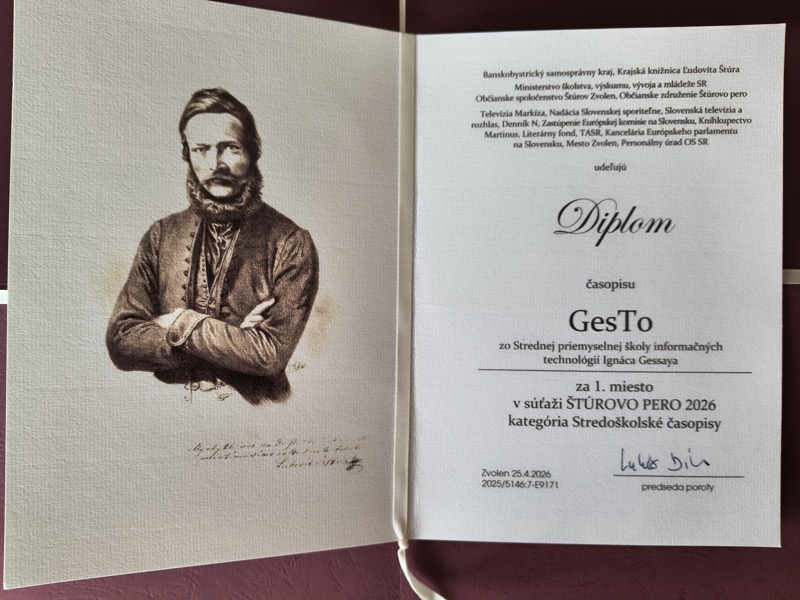 Naša škola prepísala dejiny študentskej žurnalistiky. V silnej konkurencii 50 stredoškolských časopisov z celého Slovenska ovládol náš časopis GesTo prestížnu súťaž Štúrovo pero 2026 a získal fantastické 1. miesto.